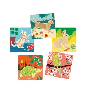 Τα παιδιά ενώνοντας δύο-δύο τα κομμάτια θα γνωρίσουν 8 ζωάκια ζούγκλας και θα εξοικειωθούν με την έννοια του παζλ.