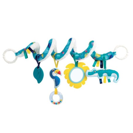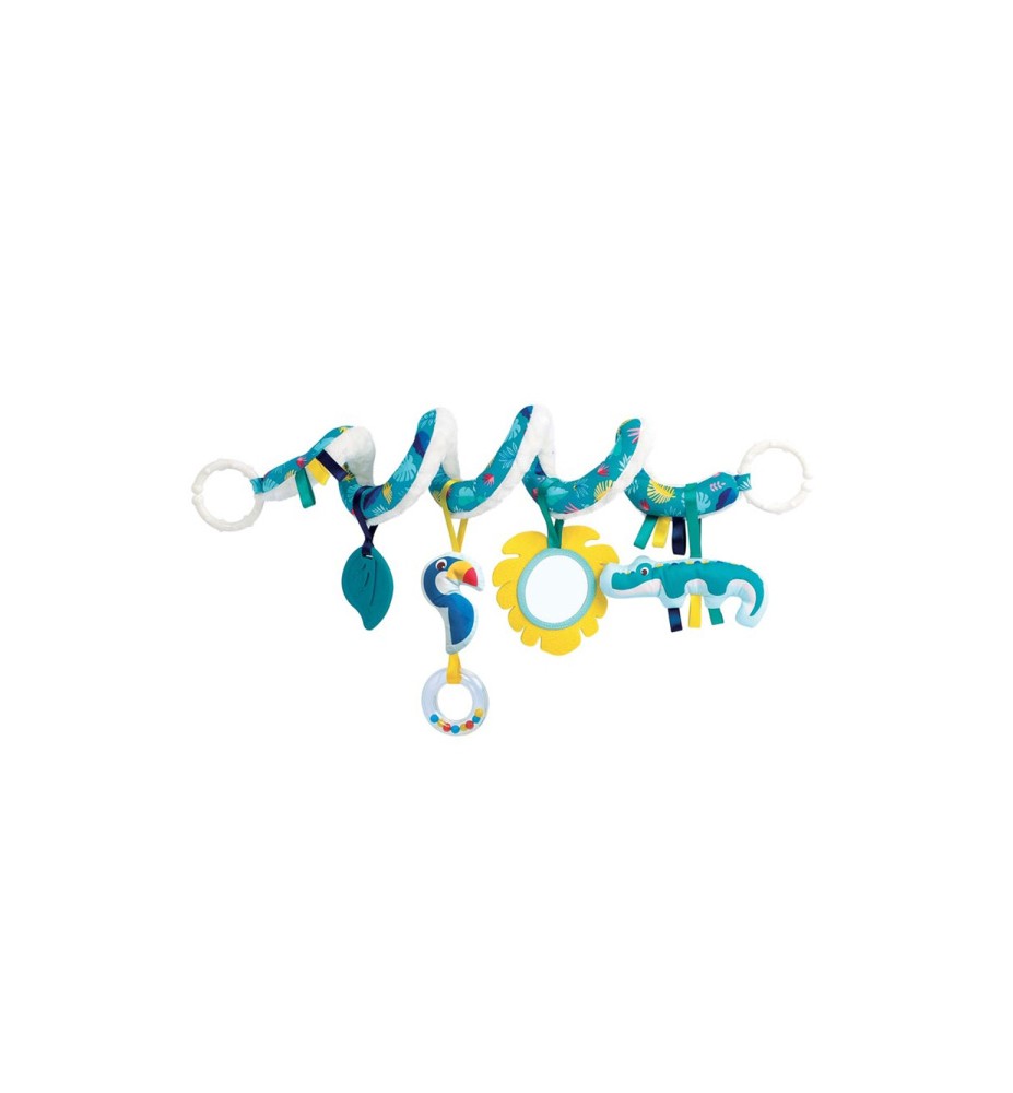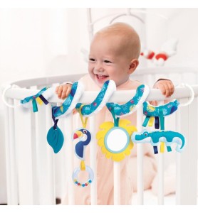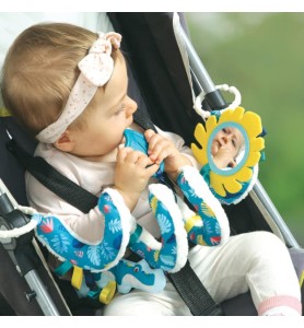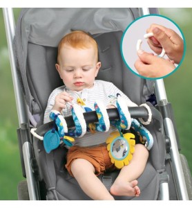 Διαθέτει καθρεφτάκι, φυλλαράκι με ήχο θροΐσματος, κουδουνίστρα με χρωματιστές χάντρες, κουδουνάκι κ.α.